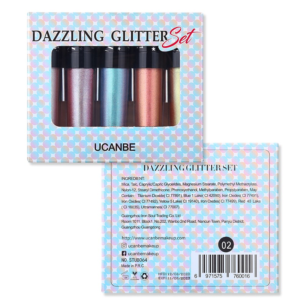 Set 1- Sparkle: Incluindo 5 cores diferentes, textura leve. Incluindo Diamond Crush, Gold Foil, Melting Rose, Lightsalmon, Dark Night. Este conjunto pode ser usado não só nas pálpebras, mas também nas sobrancelhas, lábios, bochechas, rosto e corpo para acentuar o seu estilo de maquiagem. Sugere-se que possa ser usado sobreposto a outros cosméticos.