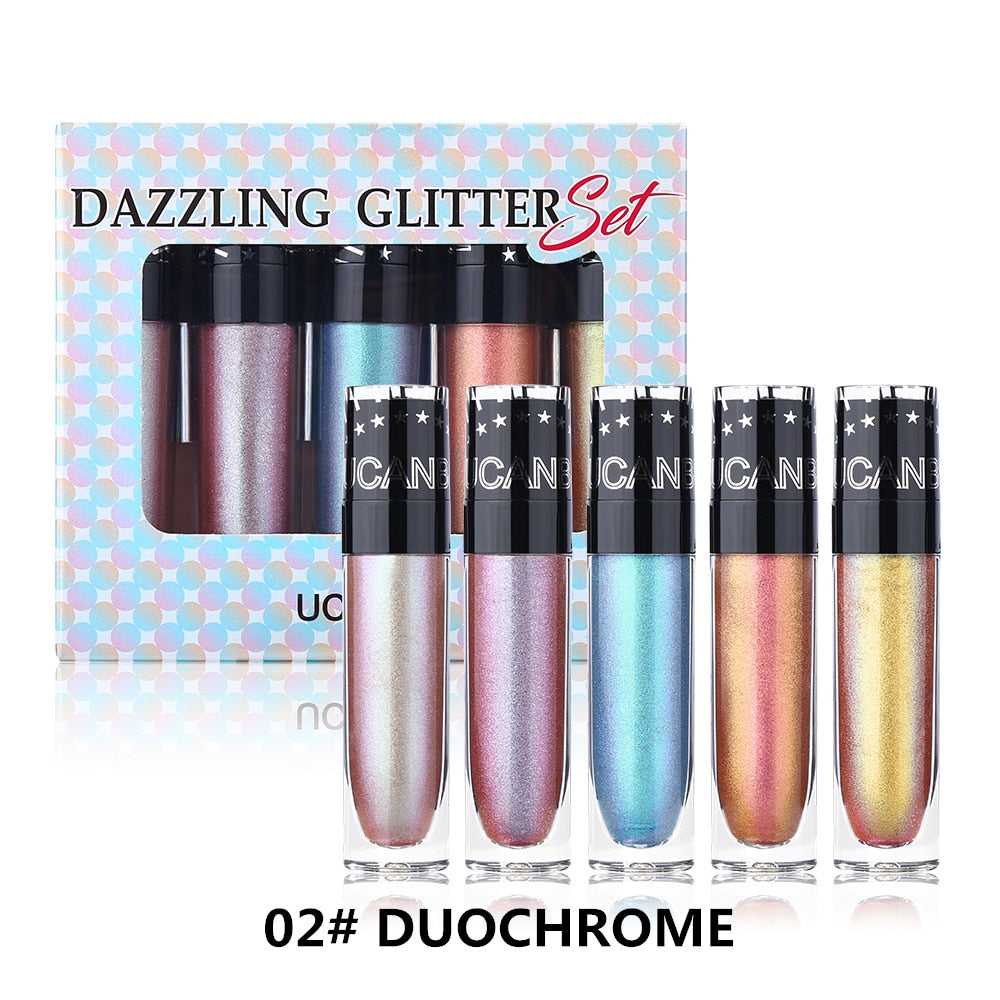 Set 2 - Duo Chrome: Existem também 5 cores: Verde sutil, Cometa, Oceano vasto, Pêssego brilhante, Império. Este líquido de sombra de olhos aparece em cores diferentes em ângulos diferentes, por isso o chamamos de duo chrome. Ele combina a perfeição do cintilante perolado e glitter para olhos com brilho incrível. Cores metálicas pesadas e de textura altamente pigmentada.